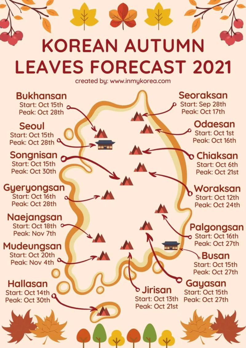 Đây là dự báo lá mùa thu Hàn Quốc năm 2021. Dự báo mới thường được đưa ra vào khoảng đầu tháng Chín năm nay.