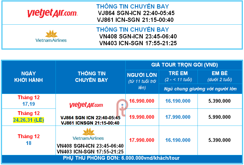 - Vé máy bay khứ hồi theo đúng chương trình của hãng hàng không VIETJET AIR,VIETNAM AIRLINES (SGN-ICN-SGN)