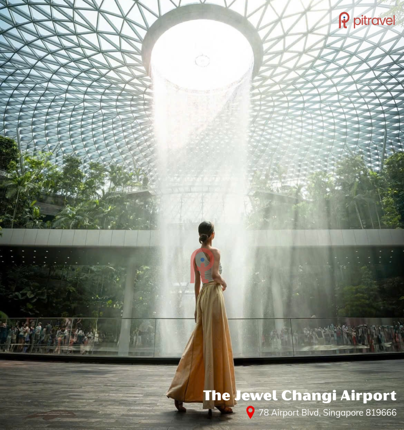 Nằm ngay trong khuôn viên sân bay, nơi đây sở hữu thác nước trong nhà cao nhất thế giới – Rain Vortex, đổ từ mái vòm kính khổng lồ xuống khu vườn xanh mát bên dưới. Không chỉ là kỳ quan kiến trúc, The Jewel còn là background hoàn hảo cho những ai yêu thích vibe hiện đại, tương lai. Chỉ cần đứng giữa vòng tròn trung tâm, tạo dáng giữa làn nước phản chiếu ánh sáng, bạn đã có ngay bức ảnh “như phim viễn tưởng”. Nếu đến vào buổi tối, hệ thống đèn đổi màu kết hợp với dòng thác sẽ khiến khung cảnh lung linh như một buổi biểu diễn ánh sáng giữa không trung.