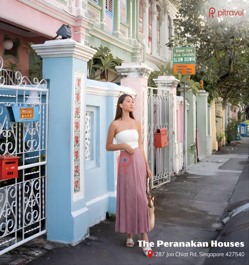 Nếu muốn tìm một góc Singapore nhẹ nhàng, hoài cổ hơn, hãy ghé The Peranakan Houses ở khu Joo Chiat. Dãy nhà cổ với gam màu pastel như hồng, xanh mint, vàng nhạt… xếp san sát nhau tạo nên khung cảnh dịu dàng, tinh tế. Đây chính là điểm chụp ảnh được yêu thích nhất của các travel blogger, đặc biệt phù hợp với concept nữ tính, vintage hoặc gia đình. Ánh nắng sớm chiếu nhẹ qua những ô cửa cổ kính càng làm khung hình trở nên ấm áp và nên thơ.