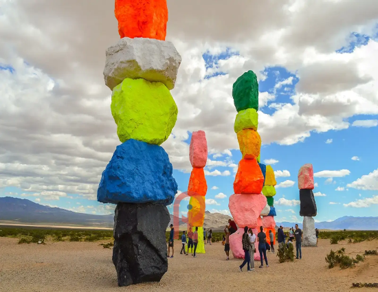 • Đoàn dừng chân tham quan Seven Magic (Công viên đá bảy màu):là điểm dừng chân phổ biến của rất nhiều khách du lịch. Thực chất, Seven Magic Mountains là một công trình nghệ thuật nằm trong dự án Human Nature do Quỹ Sản xuất Nghệ thuật (APF) tài trợ. Công trình độc đáo này được xây dựng với mong muốn thể hiện được sự hài hòa giữa những công trình nhân tạo với thiên nhiên hoang dã