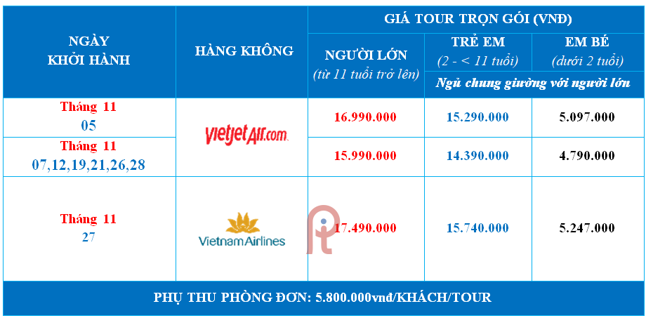 3.     Phụ thu phòng đơn (nếu có): 5.800.000/khách/tour.
