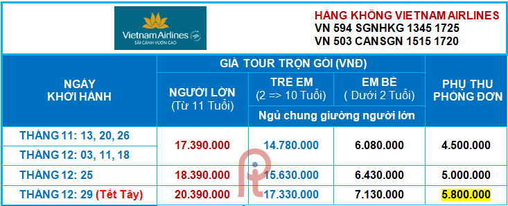 Ngày khởi hành: 05, 13, 20, 26/11; 03, 11, 18, 25, 29/12 (Tết Tây)