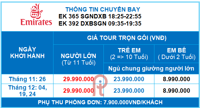 Ngày khởi hành: 26/11; 04/12, 19/12, 24/12;