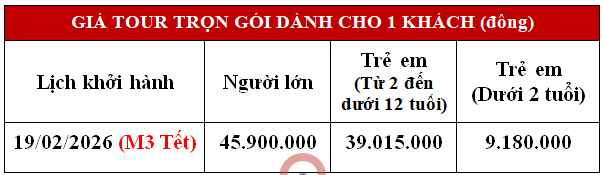 - Từ 2 – dưới 12 tuổi: 85% giá tour người lớn (ngủ ghép giường với người lớn). Một người lớn chỉ được đi kèm 1 trẻ em. Trường hợp có 2 trẻ đi kèm thì đóng tiền cho 1 trẻ như người lớn để lấy thêm giường ngủ.