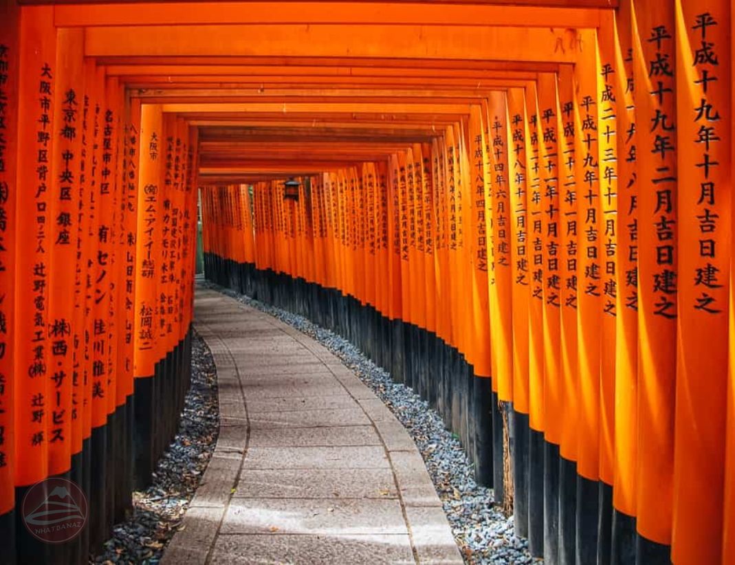 • Đền ngàn cột Fushimi Inari: là một đền thờ Thần đạo được biết đến với khoảng 10.000 cổng torii màu đỏ son uốn lượn trên một con đường đi bộ dài hai giờ. Ngay sau khi xây dựng ngôi đền, để chứng minh sự đóng góp của những người thờ phụng, một cổng torii sẽ được xây dựng với tên của họ được ghi trên đó. Chẳng mấy chốc, hàng trăm hàng nghìn người muốn có được vận may tương tự và đã đến ngôi đền nổi tiếng này để mua cổng torii của riêng họ, tạo ra đường hầm “Senbon Torii” mà bạn thấy ngày nay.