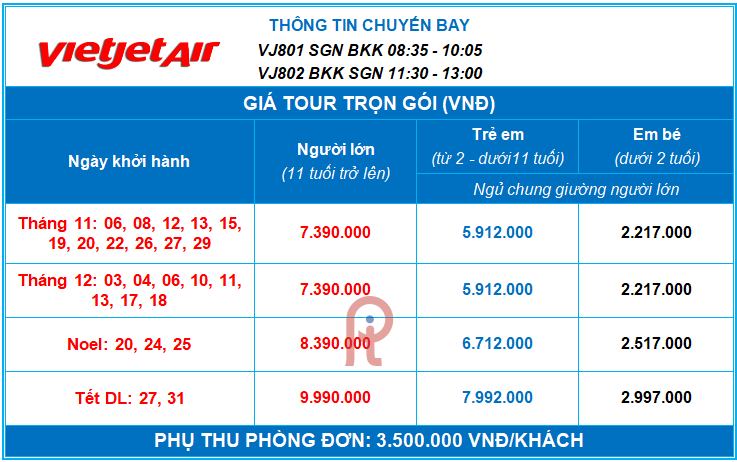 Ngày khởi hành: 06, 08, 12, 13, 15, 19, 20, 22, 26, 27, 29/11; 03, 04, 06, 10, 11, 13, 17, 18/12, Noel: 20, 24, 25/12, Tết DL: 27, 31/12