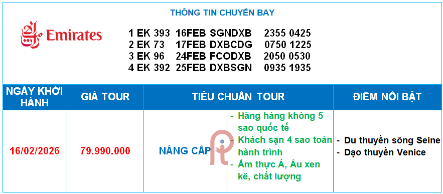 Giờ bay dự kiến: EK 393 16FEB SGNDXB 2355 – 0425// EK 73 17FEB DXBCDG 0750 – 1225