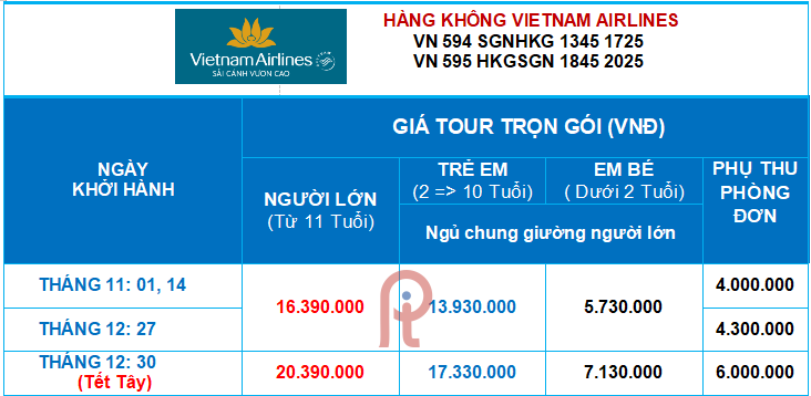 Ngày khởi hành: 14/11; 27/12; 30/12 (Tết Tây)