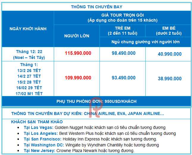 - Vé máy bay quốc tế khứ hồi theo chương trình: HCM – SAN FRANCISO/ NEW YORK – TP. HCM (hạng phổ thông), hành lý xách tay 7kg + 2 kiện hành lý ký gửi không quá 23kg/kiện.