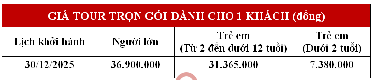- Trong trường hợp chỉ có 01 khách (người lớn) đi với 01 bé (dưới 12 tuổi), quý khách vui lòng đóng tiền tour cho Bé ngủ giường riêng.