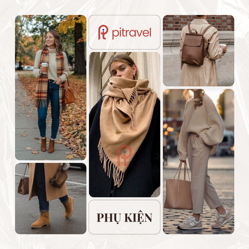 Hành trình Châu Âu mùa thu sẽ thật trọn vẹn nếu bạn có một đôi giày đồng hành thoải mái. Giày thể thao êm ái sẽ giúp bạn tận hưởng trọn vẹn từng bước chân trên những con đường lát đá cổ kính, trong khi bốt cổ thấp chống nước mang lại sự an tâm cho những cơn mưa bất chợt mà vẫn giữ nguyên vẻ thanh lịch. Ngoài ra, khăn choàng chính là điểm nhấn hoàn hảo, có thể là khăn lụa mảnh mai để tô điểm cho trang phục hoặc khăn dày ấm áp cho những buổi sớm mai se lạnh. Một chiếc túi vải cỡ vừa, balo nhỏ hoặc túi đeo vai sẽ tiện lợi để mang theo chai nước, ô gấp và áo khoác dự phòng gọn nhẹ nhưng cực kỳ hữu ích.